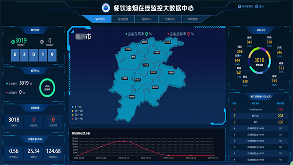 餐飲油煙在線監控平臺可實時監測油煙、顆粒物、非甲烷總烴濃度及凈化器和風機的工作狀態,集成“數據采集與管理系統”、“數據統計與查詢系統”、“餐飲企業管理系統”、“報警管理系統”、“GIS網絡地理信息系統”等相關功能,實現了不同空間、不同維度圖文一體化的應用分析。